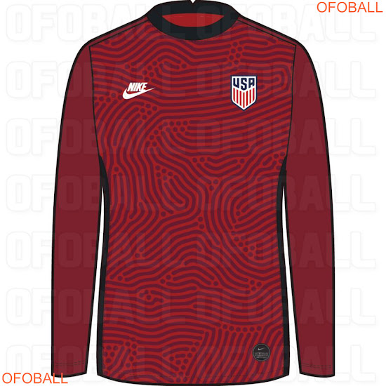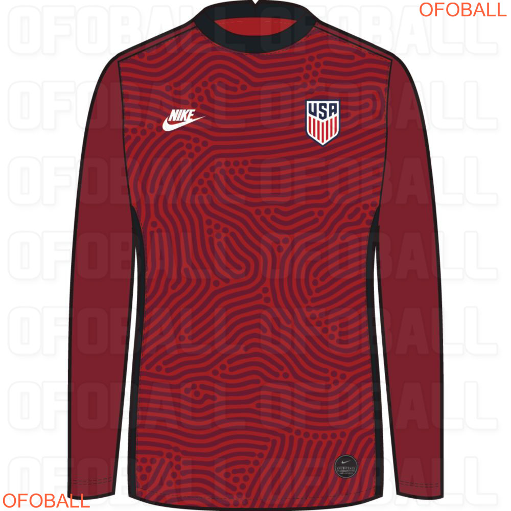 Das neue USA 2020 Torwart-Trikot, das auf dem neuen Nike Gardien III Template basiert, ist überwiegend dunkelrot mit einem schwarzen Rundhalskragen und einem weißen "Futura"-Logo auf der rechten Brust.