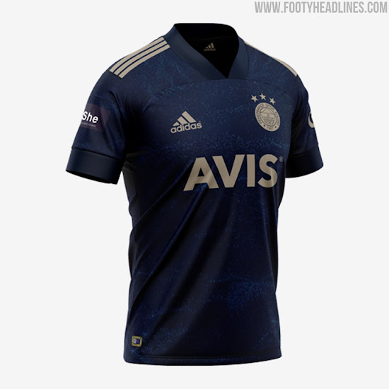 Das dritte Adidas Fenerbahce 2020-21 Trikot weist ebenfalls Metallic-Gold auf, wenn auch als Zweitfarbe auf dunkelblauer Grundlage.