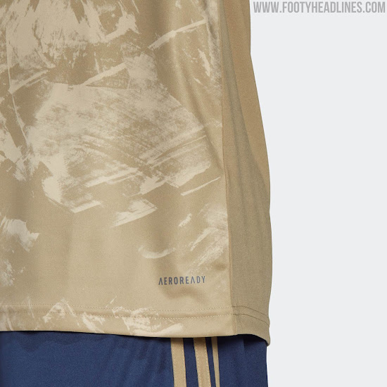 Das Adidas Fenerbahce 2020-21 Trikot kombiniert die Hauptfarbe Gold mit marineblauen Details.