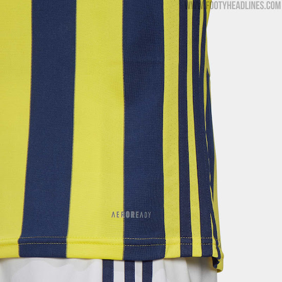 Das Fenerbahce 20-21 Trikot von Adidas führt ein schlichtes Design mit traditionellen blauen und gelben Streifen ein, kombiniert mit einfarbigen gelben Ärmeln und Rückseite.