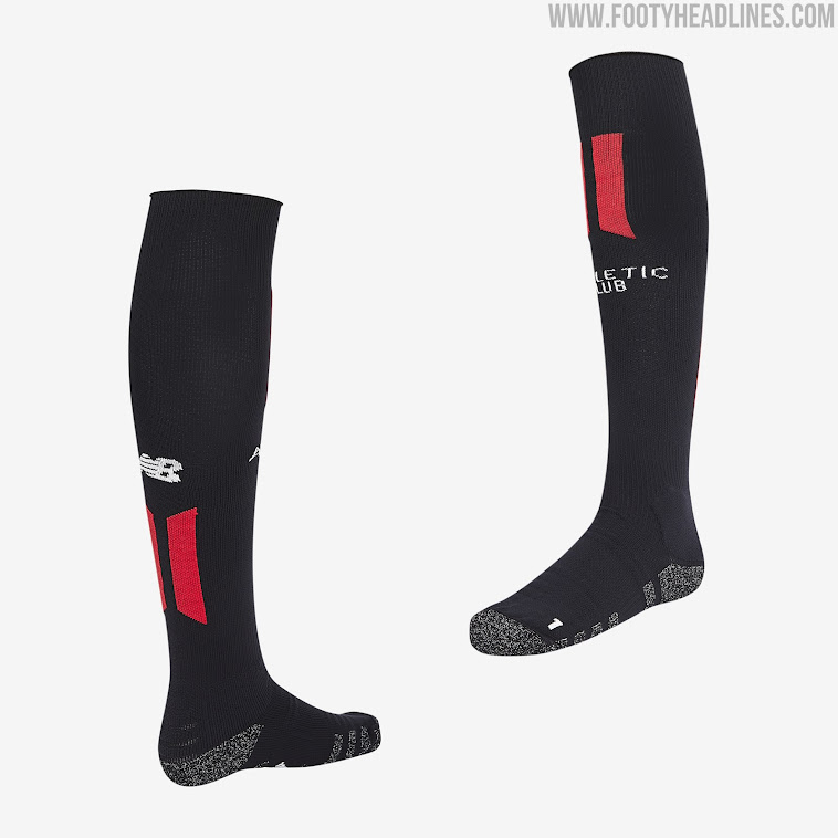 Die Hosen und Stutzen des Athletic Bilbao 20-21 Trikots sind beide schwarz, wobei letztere rote vertikale Bänder vorne und hinten aufweisen.
