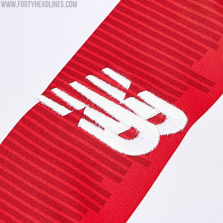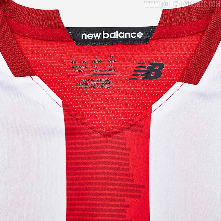 Es befinden sich drei rote und vier weiße Streifen auf der Vorderseite des New Balance Athletic Bilbao 2020-21 Trikots, das auf dem neuen NB-Template basiert und den typischen Look des Vereins aufweist.