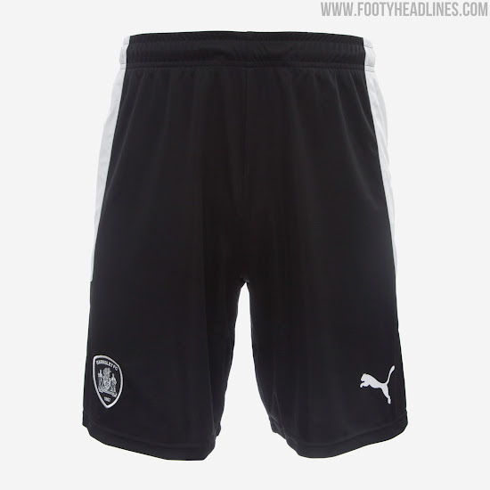 Puma kombiniert das Barnsley 2020-2021 Trikot mit schwarzen Hosen und Stutzen.