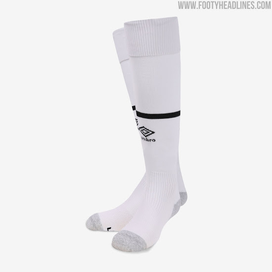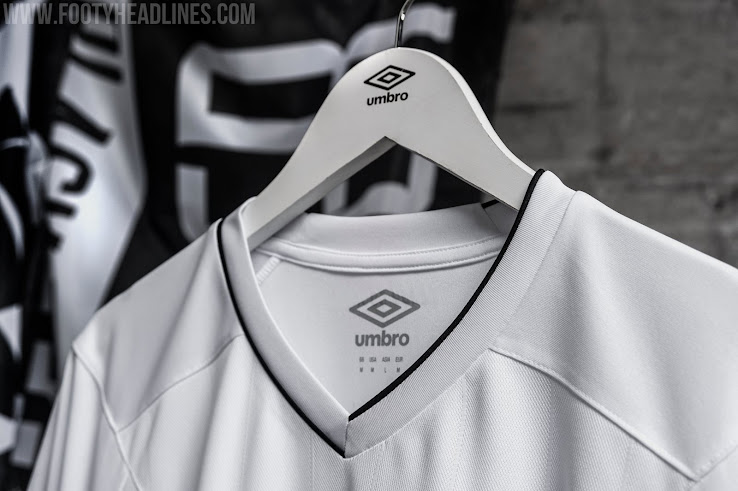 Das Umbro Derby County 20-21 Fussballtrikot, das einen schlichten Look hat, ist weiß mit schwarzen Verzierungen an Kragen und Manschetten.