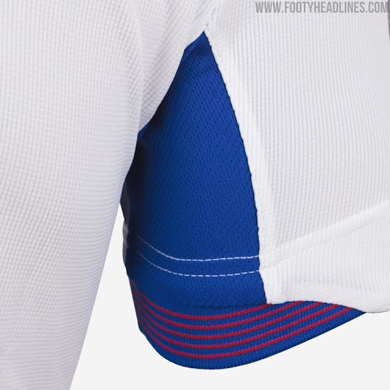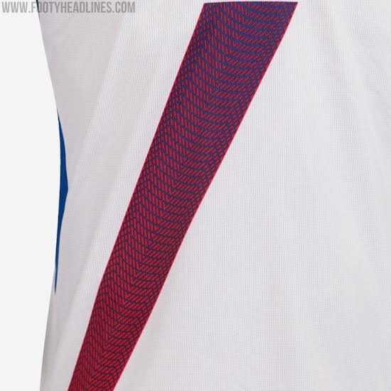 Das zweite Joma Eibar 2020-21 Trikot ist weiß mit einer Schärpe, die von Blau zu Rot verblasst, wobei sich ähnliche Grafiken auch am Kragen und an den Ärmelenden befinden.