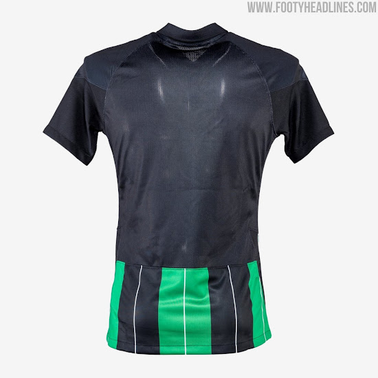 Das Nike Ferencvaros 20-21 Trikot ist mit einem Streifenmuster auf der Vorderseite versehen, das aus einem einzigen grünen Streifen in der Mitte besteht, der von zwei gleich großen schwarzen Streifen umgeben ist. Alle drei Streifen werden durch einen einzelnen, mittig angeordneten weißen Nadelstreifen geteilt, während die untere Rückseite den Look fortsetzt. Die Ärmel und die obere Rückseite sind einfarbig schwarz.