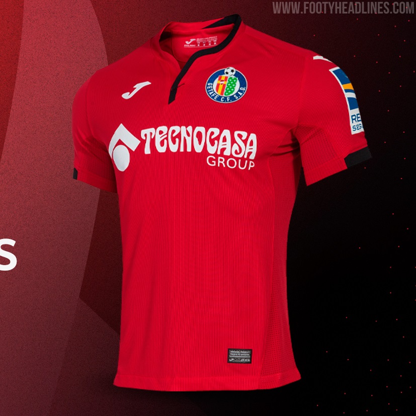 Das zweite Joma Getafe 2020-2021 Trikot ist rot mit weißen Logos. Es basiert auf dem gleichen Template wie das Heimtrikot und wird ebenfalls mit schwarzen Details für die Opfer von COVID-19 ausgestattet.