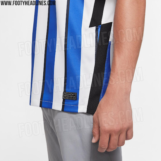 Das Nike Hertha BSC 2020-21 Trikot, das einen maßgeschneiderten neuen Look für den Club hat, weist relativ dünne weiße und blaue Streifen auf, mit zusätzlichen schwarzen Rändern auf der linken Seite jedes blauen Streifens.