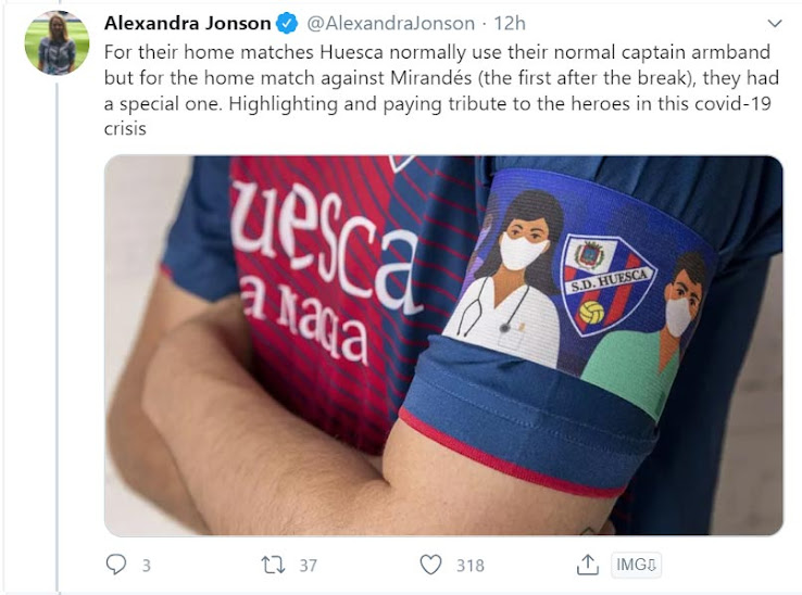 Der SC Huesca trägt bei seinen Heimspielen immer die gleiche Kapitänsbinde. Man trug eine spezielle Kapitänsbinde zu Ehren derjenigen, die an der ersten Front gegen die COVID-19-Krise kämpfen.