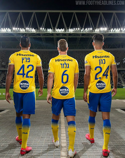 Fila kombiniert das Maccabi Tel Aviv 2020-21 Trikot mit blauen Hosen und gelben Stutzen.