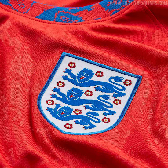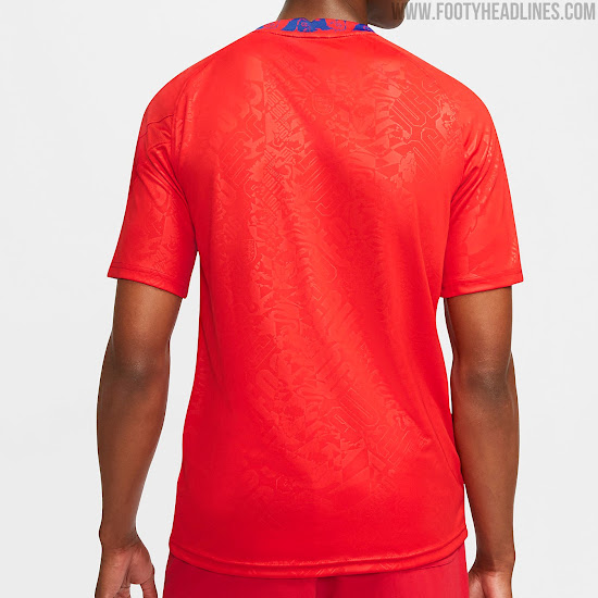 Das Nike England 2020 Aufwärm-Trikot, das hauptsächlich rot ist, besticht durch einen allumfassenden Jacquard-Druck, der auf dem Rundhalskragen auffälliger - rot auf blau - vorhanden ist. Das Ganze basiert auf dem neuen Nike-Template.