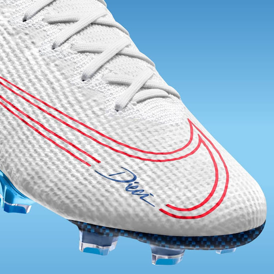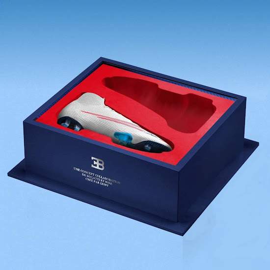Inspiriert von Cristianos Leidenschaft für Geschwindigkeit und seiner Liebe zu den prestigeträchtigen und schnellen Bugatti-Supersportwagen, sind die Nike Mercurial Superfly 7 Elite Konzept-Fussballschuhe von Gunt22 weiß mit einer blauen Karbonfaser-Sohle.