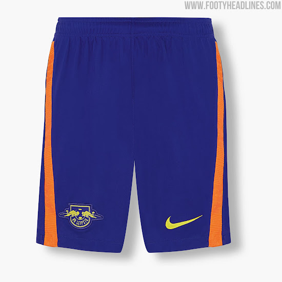 Das Nike Leipzig 20-21 Trikot, das ein mutiges neues Design hat, ist dunkelblau mit leuchtend gelben Logos, darunter einfarbige Logos von Red Bull.