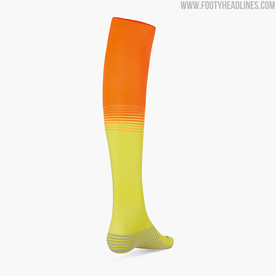Blaue Hosen und orange-gelbe Stutzen runden das Trikot ab.