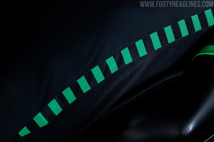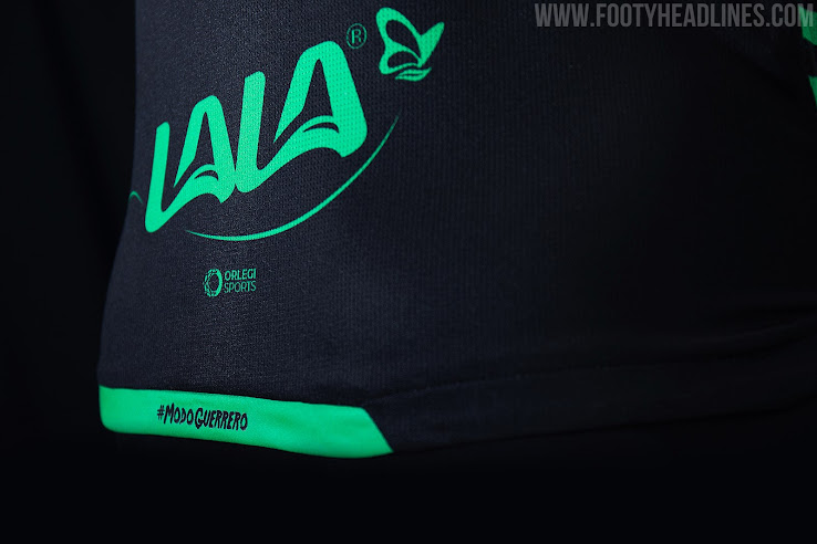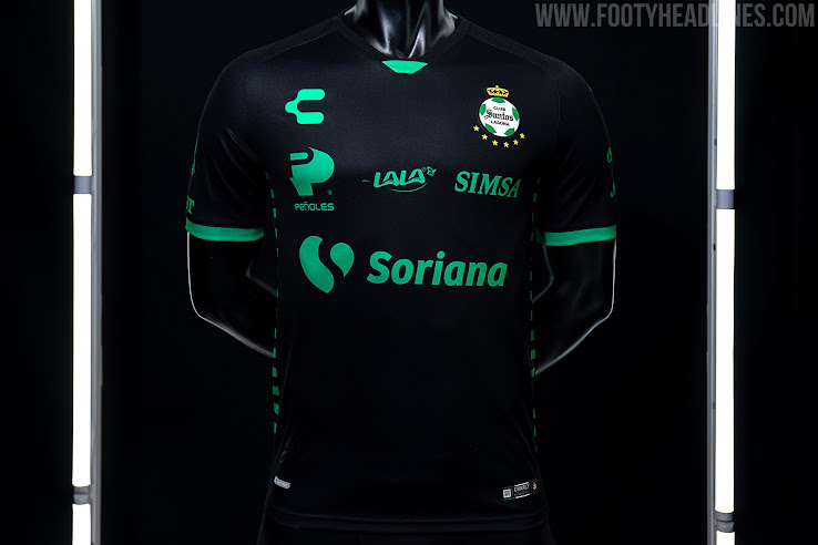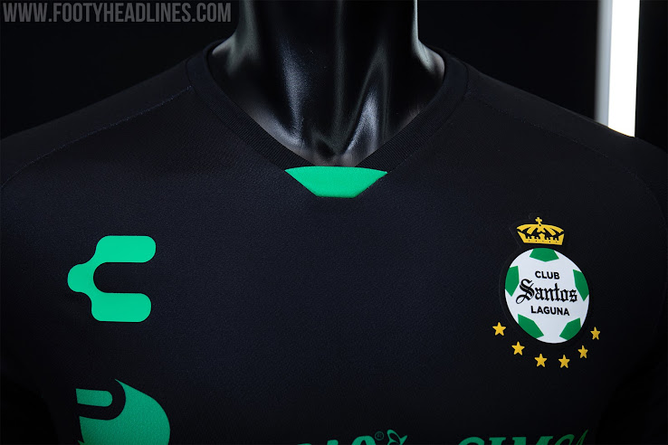 Das Charly Santos Laguna 2020-2021 Fussballtrikot ist schwarz und die verschiedenen Logos erscheinen in grün. Mehr Grün ist in Form der Ärmelbündchen und eines Panels vorne am Kragen vorhanden.