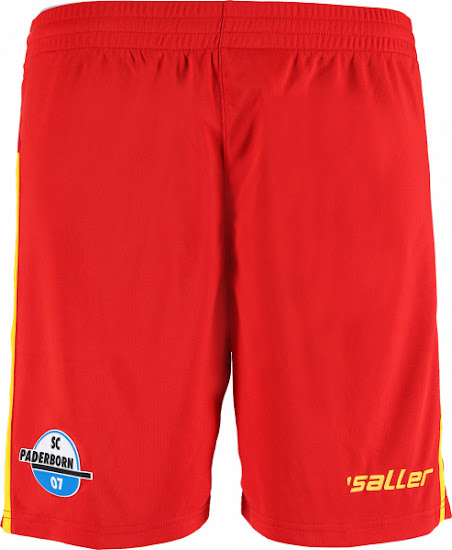 Rote Hosen und Stutzen mit einem gelben oberen Teil runden den Look des Paderborn 2020-2021 Fussballtrikots von Saller ab.