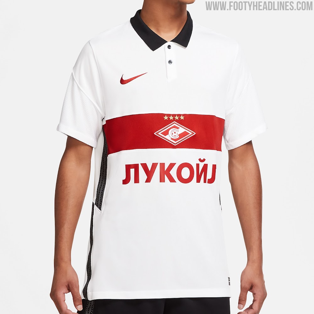 Das Nike Spartak 2020-21 Trikot, das dasselbe grundlegende Design aufweist, ist weiß mit einem schwarzen Kragen und schwarzen Zickzackstreifen auf den Seiten. Diese Streifen weisen dasselbe Muster auf, das auch auf dem gesamten Heimtrikot zu finden ist.