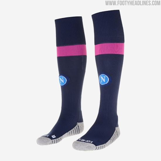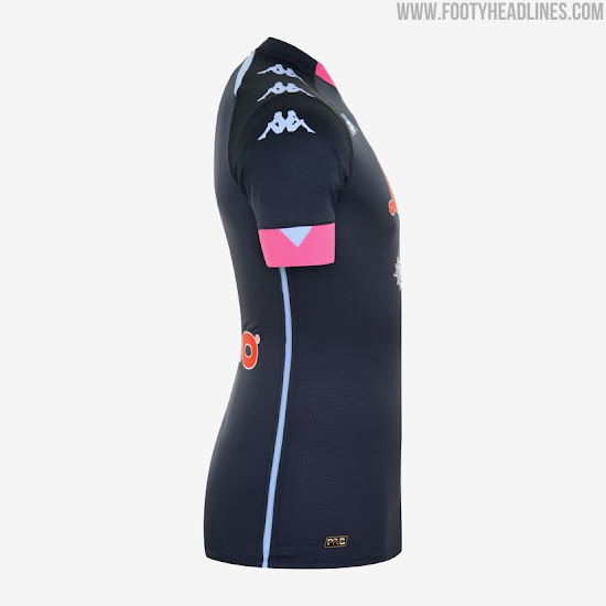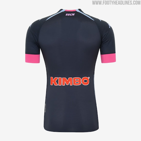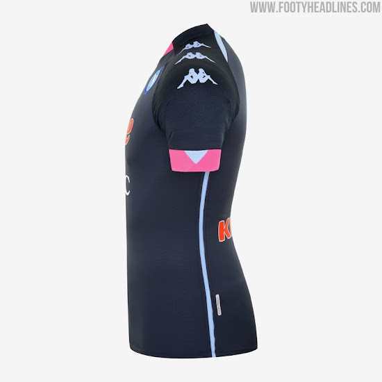 Das dritte Kappa Napoli 2020-21 Fussballtrikot, das wohl auffälligste Shirt der Kollektion, ist dunkelblau mit rosa und himmelblauen Details.