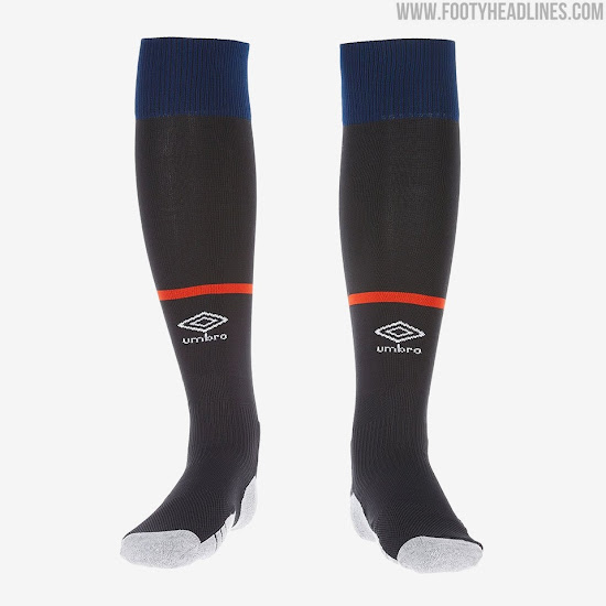 Marineblaue Hosen und orangefarbene Stutzen vervollständigen das neue Umbro Luton Town 2020-21 Trikot.