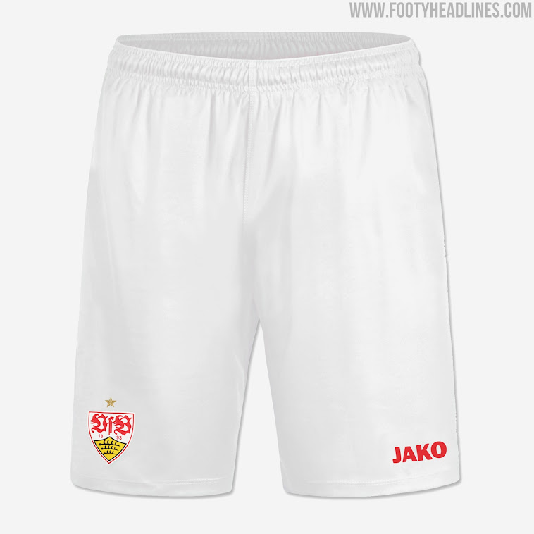 Jako kombiniert das VfB Stuttgart 2020-2021 Trikot mit weißen Hosen und Stutzen.