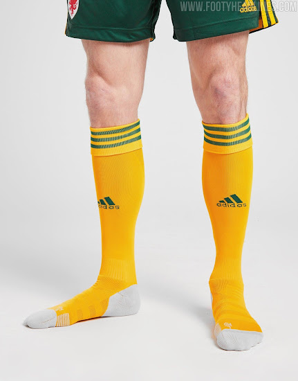Grüne Hosen und gelbe Stutzen komplettieren den Look des neuen Wales 2020 Trikots.