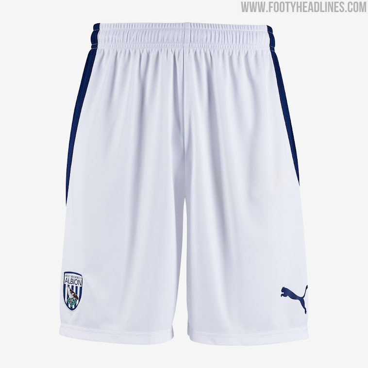 Weiße Hosen und blaue Stutzen runden den Look des neuen West Bromwich Albion 2020-21 Trikots von Puma ab.