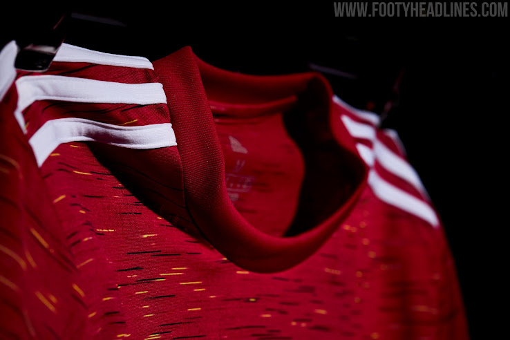 "Unter dem Einfluss der Feinheiten der Garn-Stichapplikation auf dem Trikot bietet ein feiner grafischer Druck ein einzigartiges Muster und Details auf einem farbigen Blockhintergrund. Der Name des Vereins ist ebenfalls stolz in den Druck eingearbeitet, sichtbar durch die Verwendung verschiedener Rottöne.