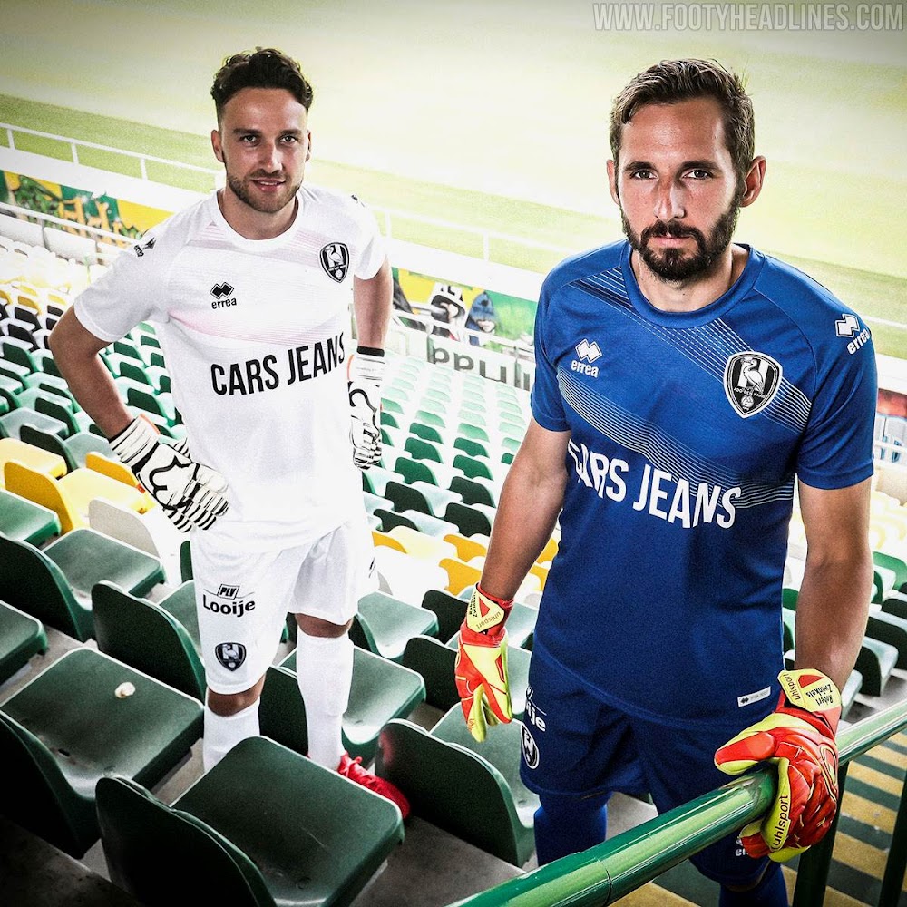 Das erste Errea ADO Den Haag 2020-21 Torwart-Trikot ist blau, gefolgt von einem weißen und einem rosa Trikot. Bei allen Torhütertrikots gibt es ein Wellenlinienmuster über der oberen Hälfte der Vorderseite des Trikots.
