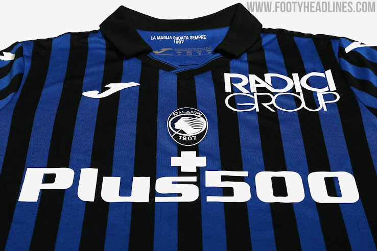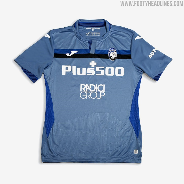 Das Joma Atalanta 2020-21 Trikot ist identisch mit dem UEFA CL Trikot, das letzten Monat enthüllt wurde: es weist dünne schwarze und blaue Streifen auf, kombiniert mit einem traditionellen Kragen in Schwarz und schwarzen Ärmelenden.