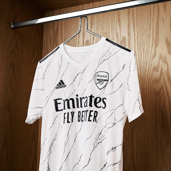 Das erst vor wenigen Tagen enthüllte Arsenal 2020-2021 Auswärtstrikot besticht durch ein von Marmor inspiriertes Design in Rot auf Weiß, kombiniert mit schwarzen Logos.