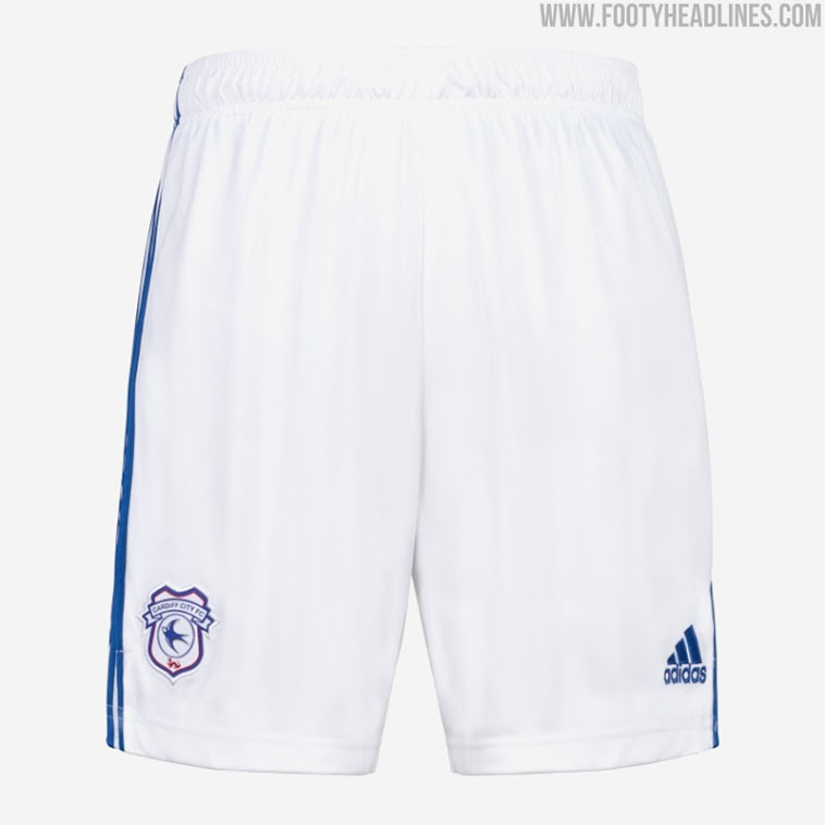 Adidas kombiniert das Cardiff City 2020-2021 Trikot mit weißen Hosen und blauen Stutzen.