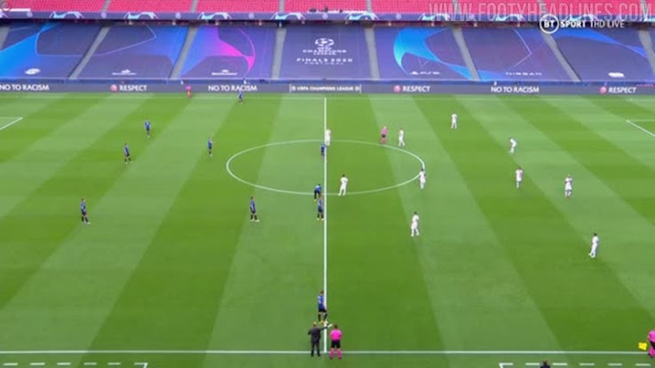 Für die erste Tribüne entwarf und produzierte die UEFA eine Plastikplane zum Thema UEFA Champions League mit den Logos der offiziellen Sponsoren der UEFA.