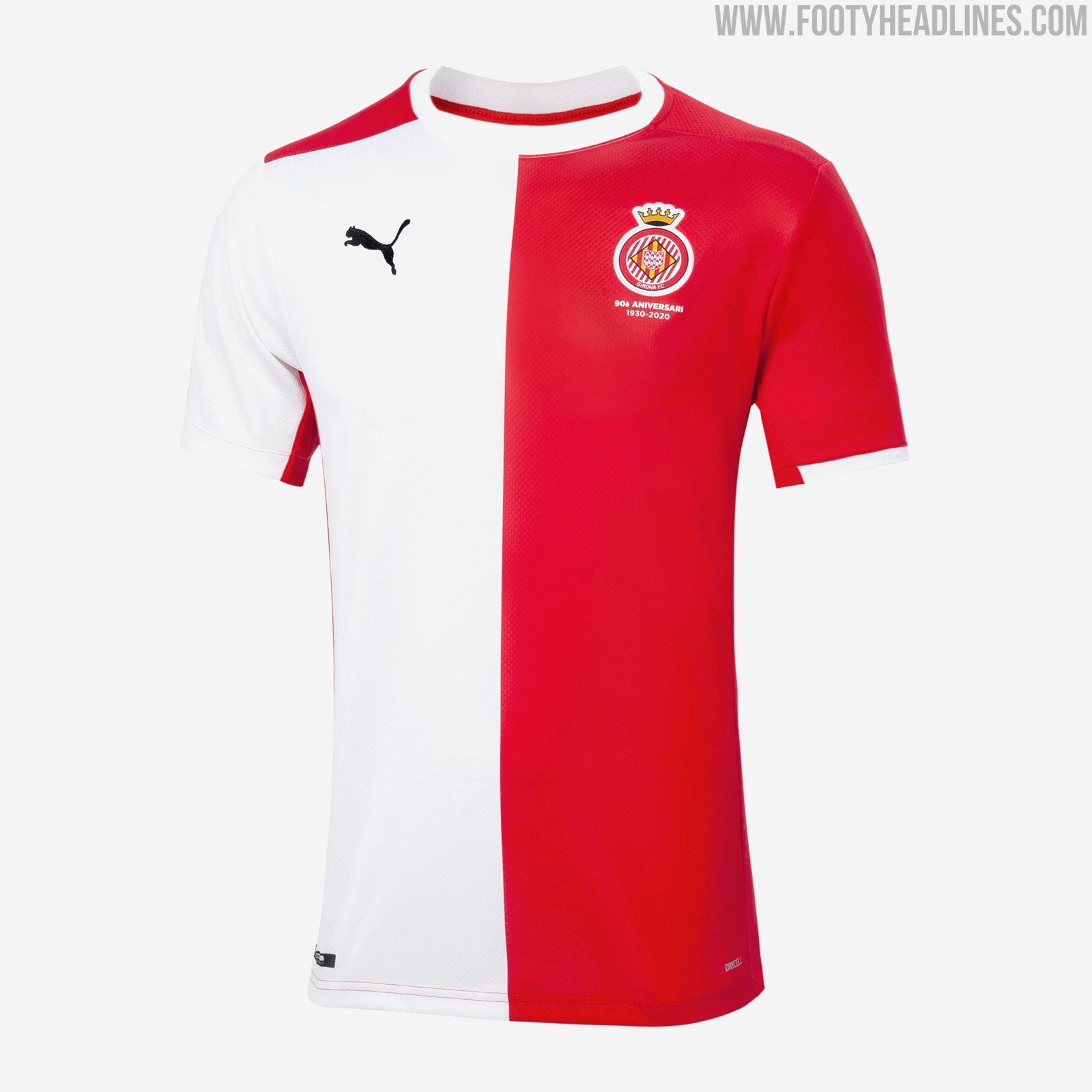 Das Puma Girona 2020-2021 Fussballtrikot führt einen Hälftenlook für den Club ein, der seit kurzem mit dem traditionellen Streifenlook experimentiert.