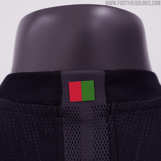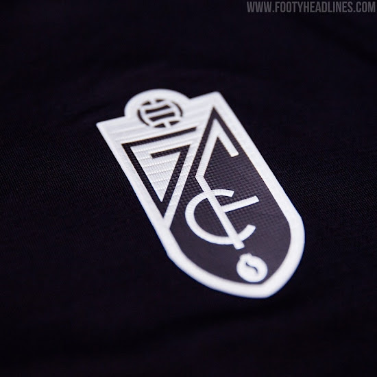 Das zweite Nike Granada CF 2020-21 Trikot, das auf dem Vapor-Template basiert, ist schwarz mit einem einfarbigen Vereinswappen auf der linken Brust. Die Flagge Granadas befindet sich auf der oberen Rückseite direkt unter dem Kragen.
