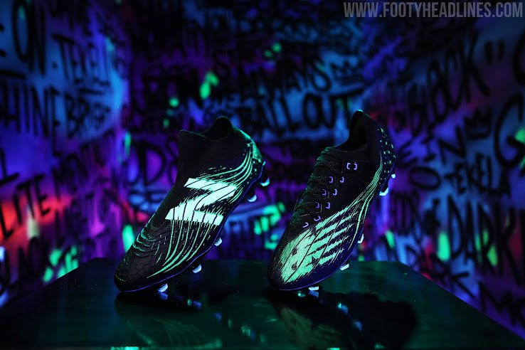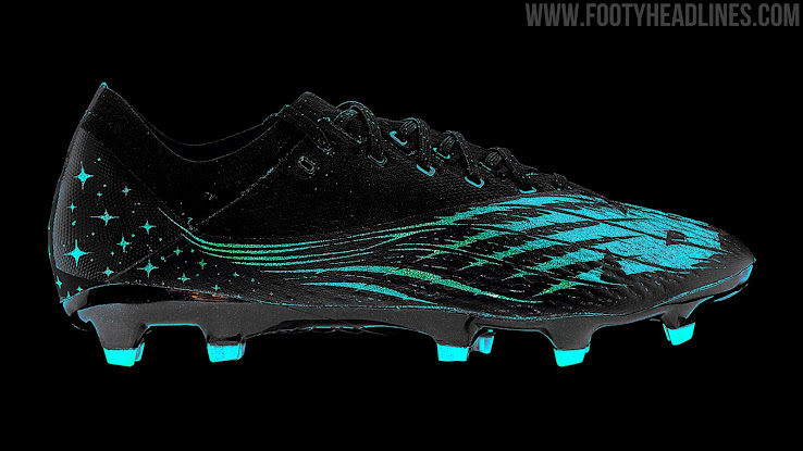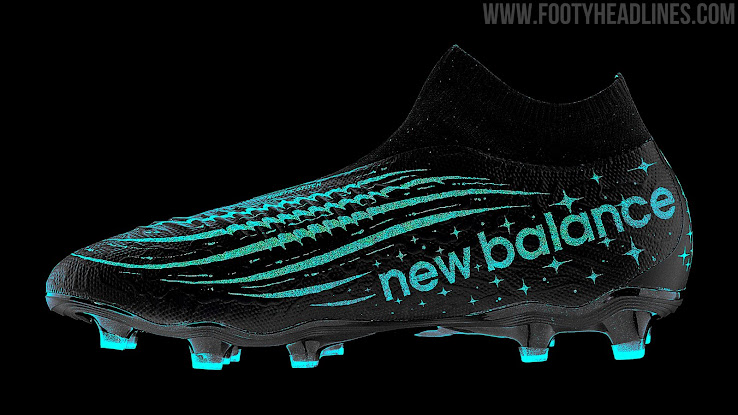 Die beiden neuen New Balance Furon v6 Fussballschuhe sind komplett schwarz, leben aber unter UV-Licht, wenn sie einen leuchtenden Sternhaufen und Lichtbänder aufweisen. Auch die Logos sind uv-aktiviert.