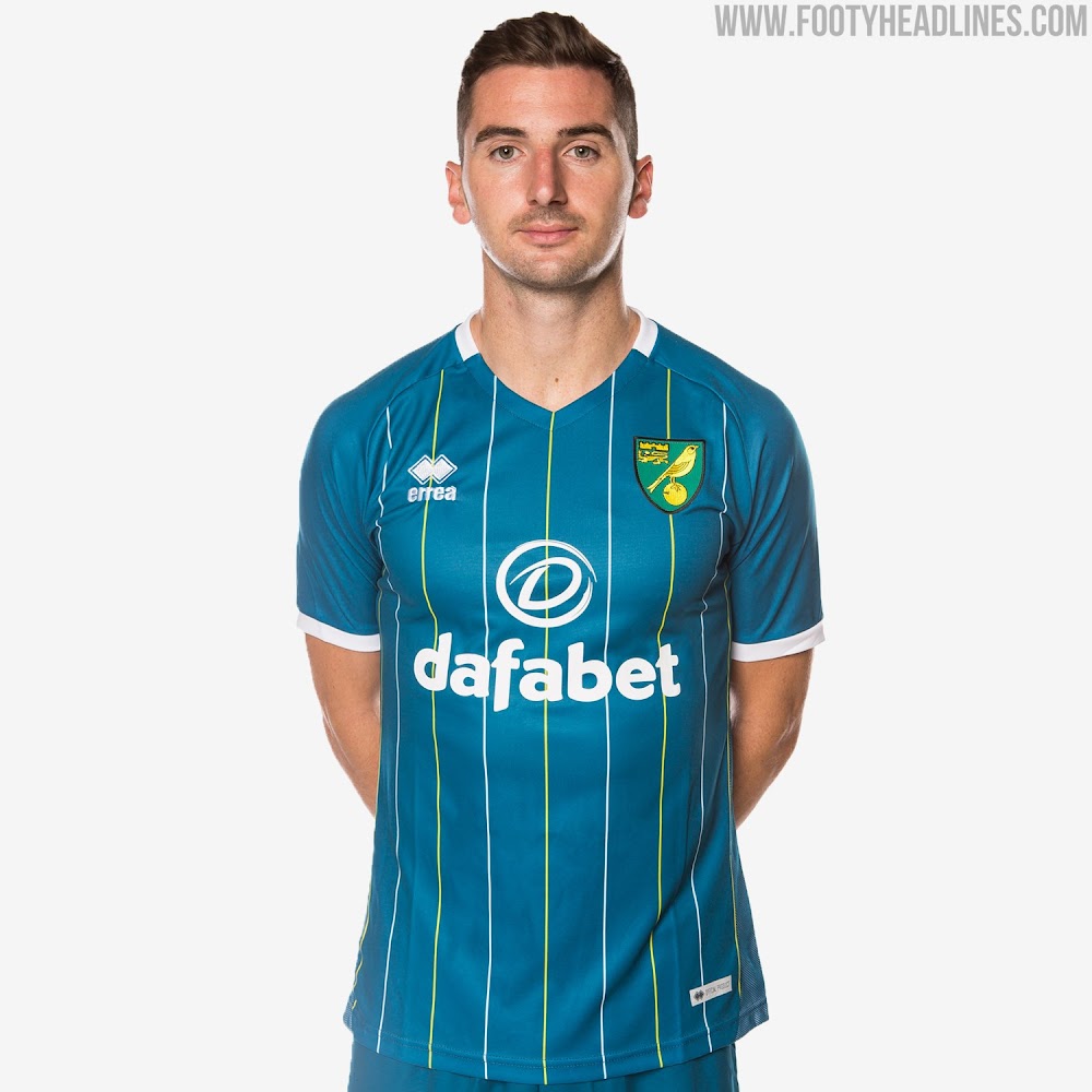 Das Errea Norwich City 2020-21 Trikot ist petrolgrün mit subtilen gelben und weißen Nadelstreifen.
