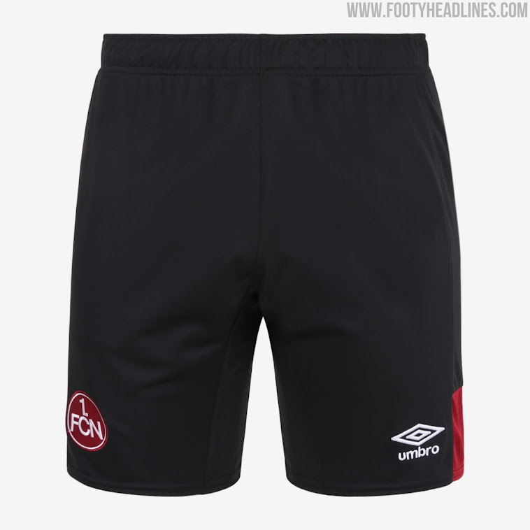 Schwarze Hosen und rote Stutzen runden den Look des neuen Nürnberg 2020-2021 Trikots von Umbro ab.