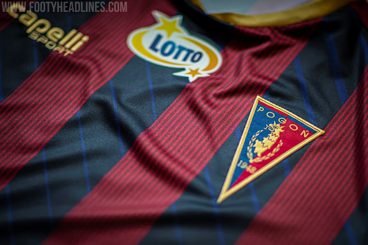 Das Capelli Sport Pogoń Stettin 2020-2021 Trikot kombiniert das Markenzeichen des Vereins, die marineblauen und kastanienbraunen Streifen, mit metallisch-goldenen Logos und Borten.