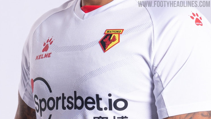Das zweite Kelme Watford 2020-21 Trikot sieht viel sauberer und schlichter aus als das Heimtrikot. Es ist weiß mit roten Details.