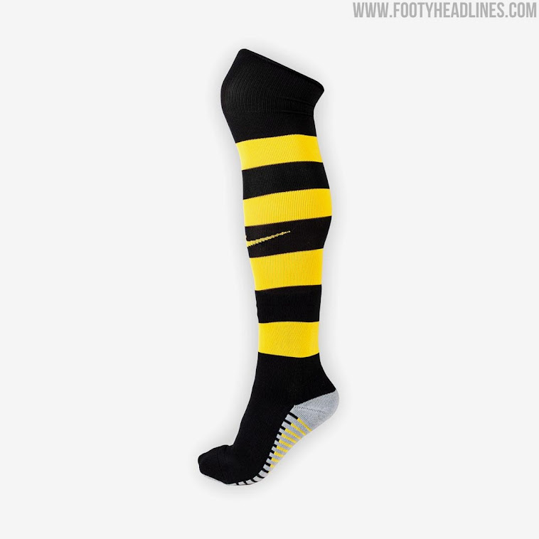 Schwarze Hosen und geringelte Stutzen komplettieren das neue Nike Young Boys 20-21 Trikot.