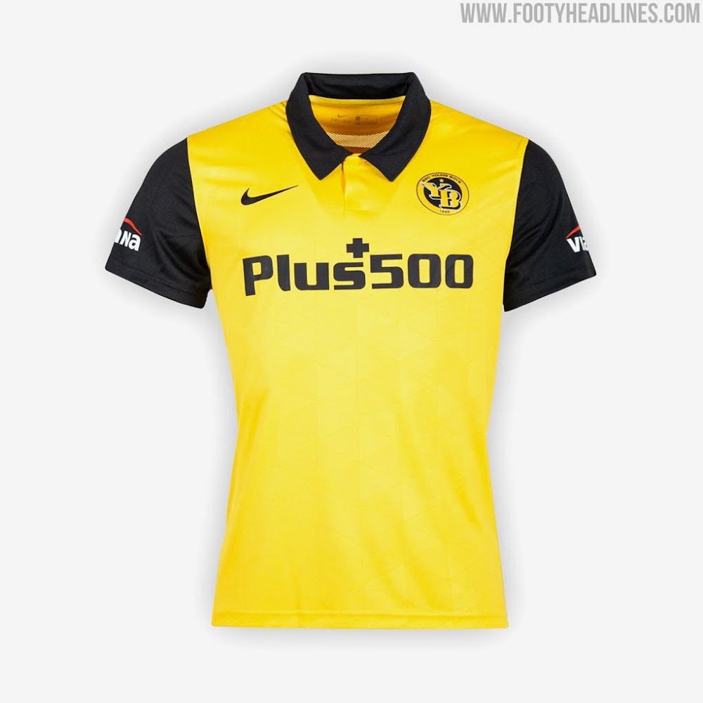 Das Nike Young Boys 2020-21 Trikot basiert auf dem Nike Trophy IV Template, jedoch in einer kundenspezifischen Farbgebung. Der Körper ist gelb und die Ärmel und der Kragen sind schwarz.