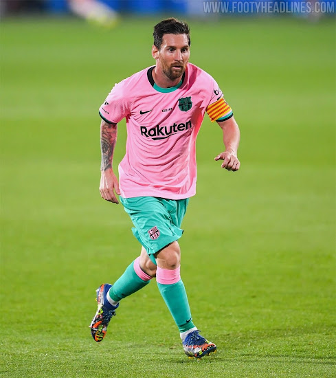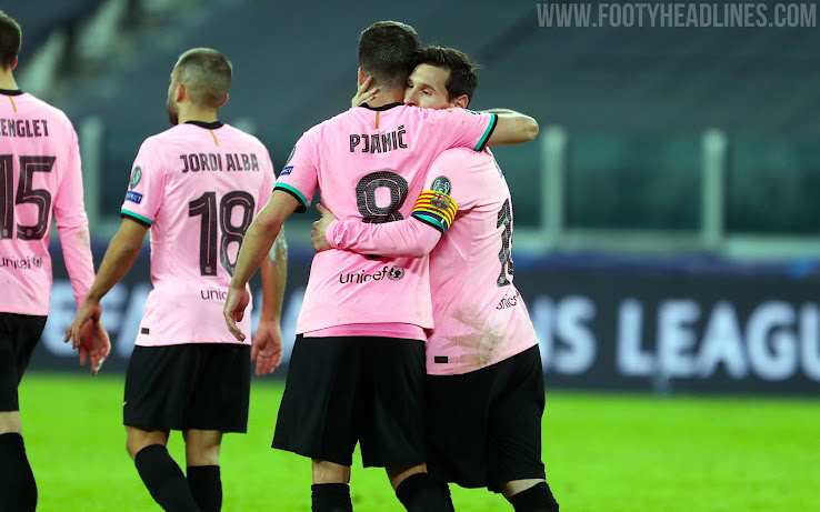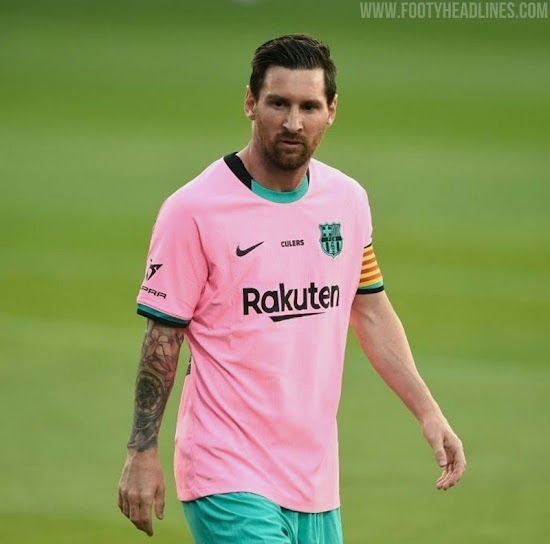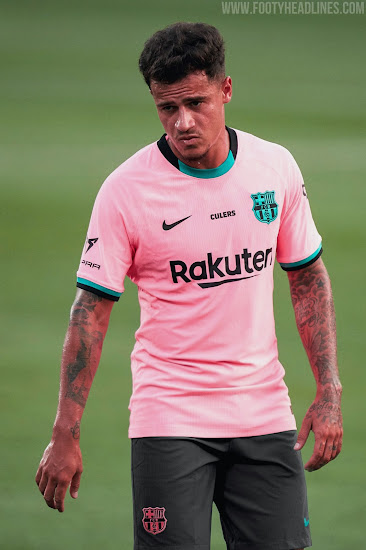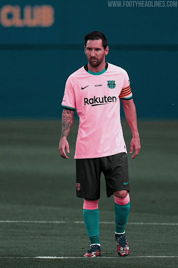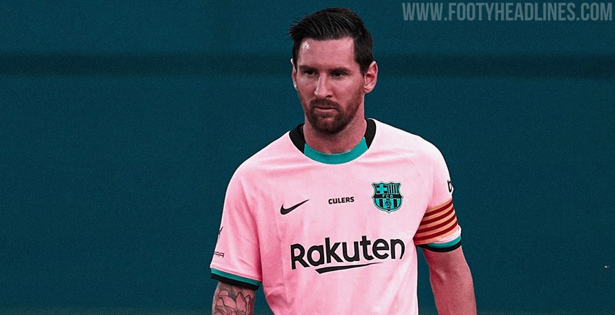 Das neue Barcelona 2020-21 Trikot kombiniert eine rosa (offiziell "Pink Beam") Grundlage mit Schwarz und Blaugrün für Logos und Verzierungen, was von Meer und Strand der Stadt inspiriert ist.