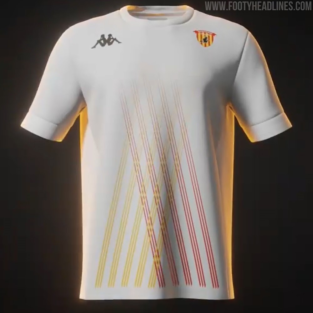 Das Kappa Benevento 20-21 Trikot ist weiß und hat ein einzigartiges rot-gelbes Streifenmuster auf der Vorderseite. Es ist von Besenhexen inspiriert.