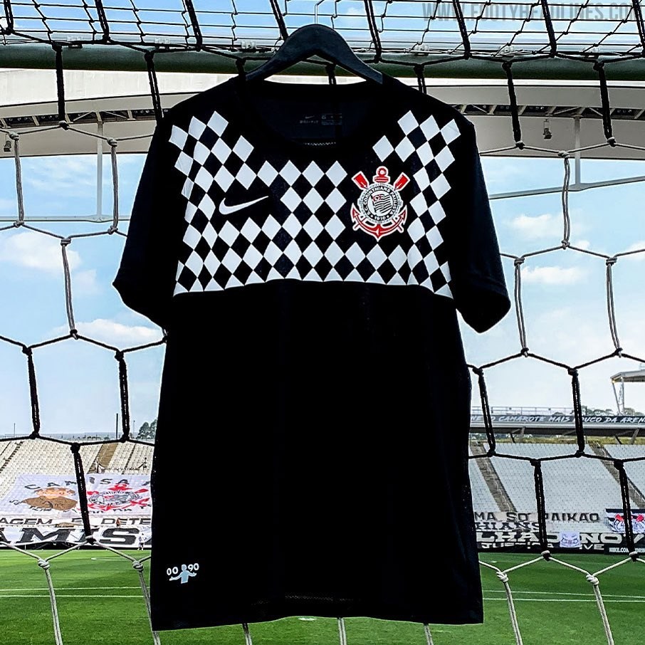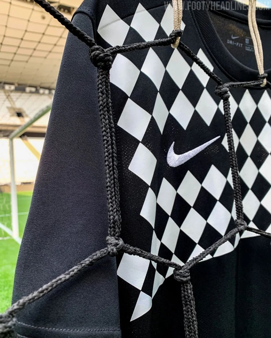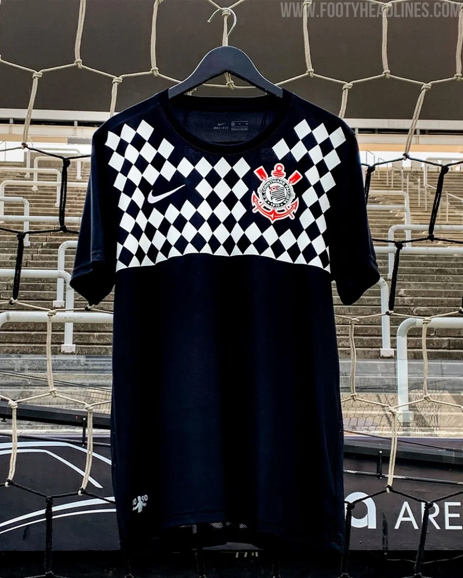 Das neue Corinthians 20-21 Sonder-Trikot ist schwarz mit einem weißen Rautenmuster auf dem oberen Teil der Vorderseite, inspiriert von dem Trikot, das Ronaldo vor 30 Jahren trug.