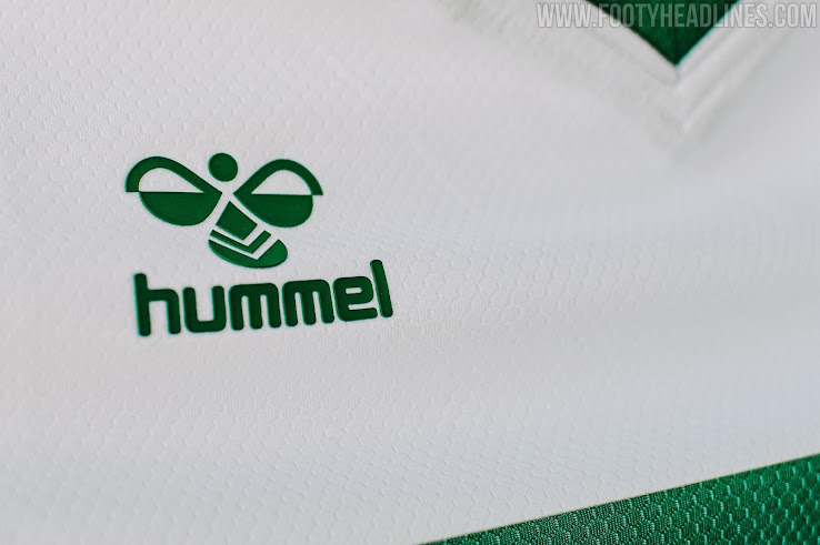 Das Hummel Elche 2020-2021 Trikot ist weiß mit dem traditionellen grünen Brustband des Vereins. Mehr Grün ist an den Seiten des Hummel Elche 2020-2021 Trikots sowie am Kragen und an den Ärmelbündchen zu sehen.