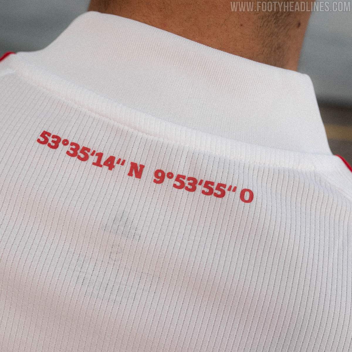 Eine kundenspezifische Wellengrafik befindet sich an den Ärmelenden des Adidas Hamburger SV 20-21 Fussballtrikots, um der Seefahrtstradition Hamburgs Ehre zu erweisen. Die Koordinaten des Volksparkstadion sind auf die obere Rückseite gedruckt - 53°35'14'' N 9°53'55'' O.