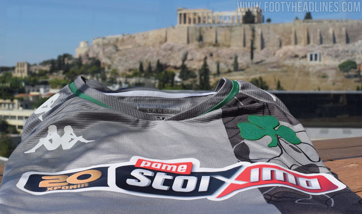 Das Kappa Panathinaikos 20-21 Fussballtrikot ist grau, grün und weiss mit einem maßgeschneiderten Streifen auf der linken Brust.
