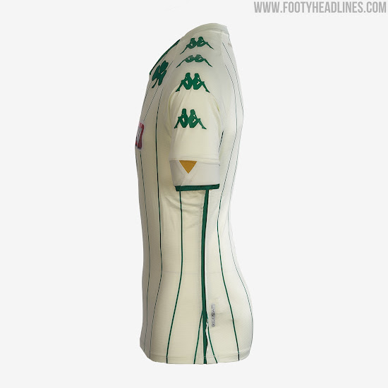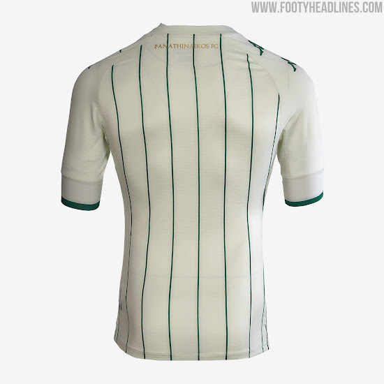Das zweite Kappa Panathinaikos 2020-21 Trikot ist beige mit grünen Nadelstreifen und grünen Logos. Das Kappa Panathinaikos 2020-2021 Fussballtrikot verwendet eine goldene Farbe für das Dreieck an den Ärmelenden und den Panathinaikos-Text auf dem Rücken unter dem Kragen.