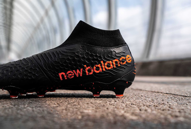 Die New Balance 2020-2021 Leder-Fussballschuhe kombinieren eine schwarze Grundlage mit markanten orangen Akzenten.