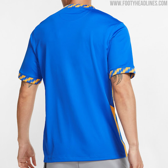 Das zweite Kaizer Chiefs 2020-21 Trikot von Nike ist noch auffälliger als das Heimtrikot. Das Nike Kaizer Chiefs F.C. 2020-2021 Trikot kombiniert eine auffällige blaue Hauptfarbe mit gelben Zickzack-Mustern am Kragen, an den Ärmelbündchen und auch an den Seiten.